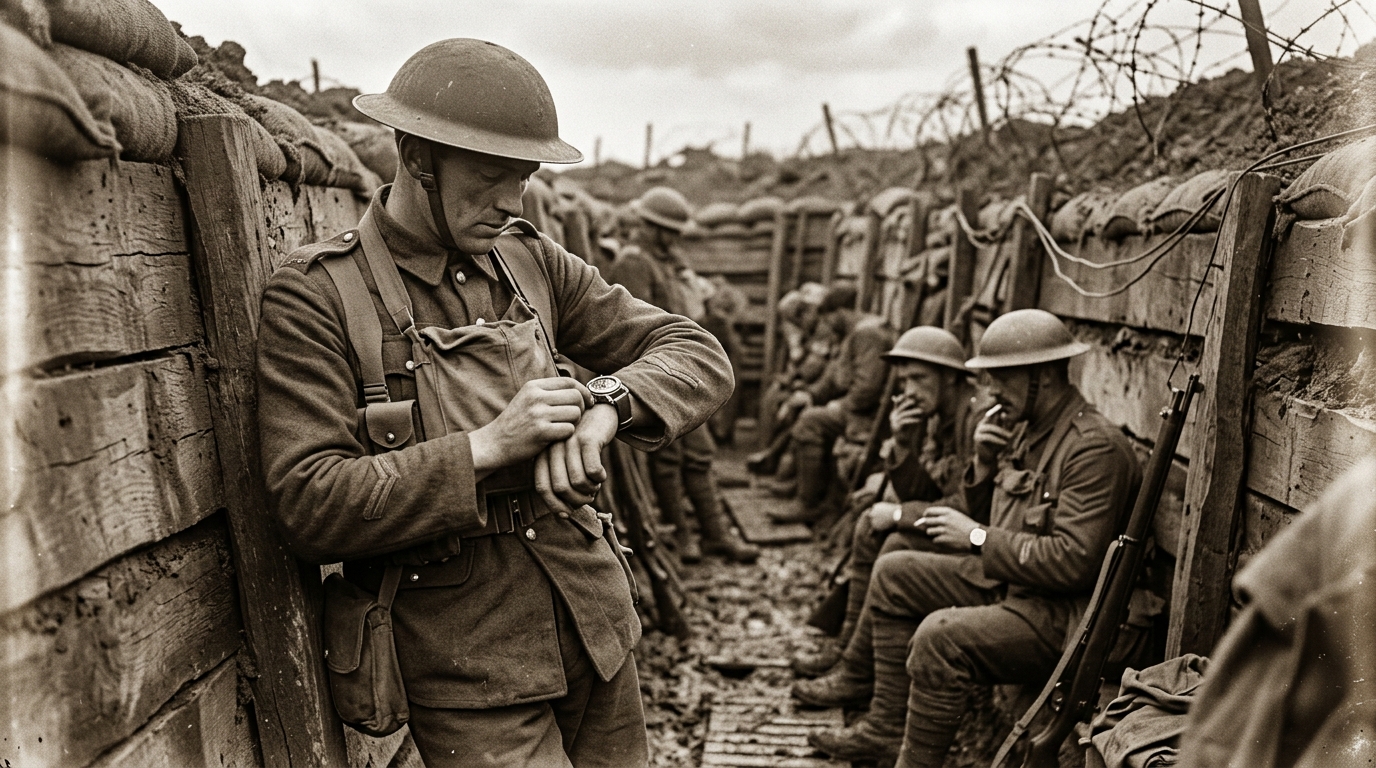 1914년 1차 세계대전이 발발하면서 손목시계의 실용성은 전장에서 완벽하게 증명되었습니다. 참호 속 병사들에게 회중시계는 사치였습니다. 두 손이 자유로운 손목시계는 생존의 도구였습니다.