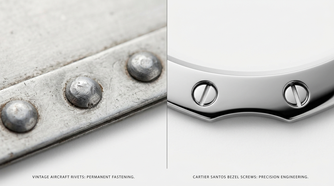 산토스 워치의 베젤에는 작은 나사들이 규칙적으로 배열되어 있습니다. 이것은 당시 비행기와 철골 구조물을 고정하는 **리벳(Rivet)**에서 직접적으로 영감을 받은 것입니다.