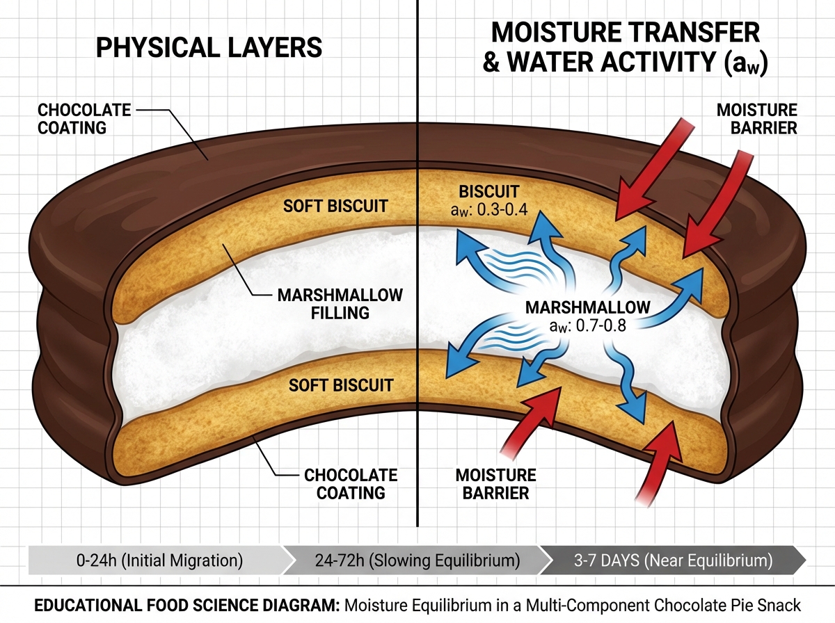 갓 만들어진 초코파이의 비스킷은 수분 활성도(Water Activity)가 약 0.3-0.4 수준으로 바삭하고 건조합니다. 반면 마시멜로는 0.7-0.8의 높은 수분 활성도를 가지고 있죠.