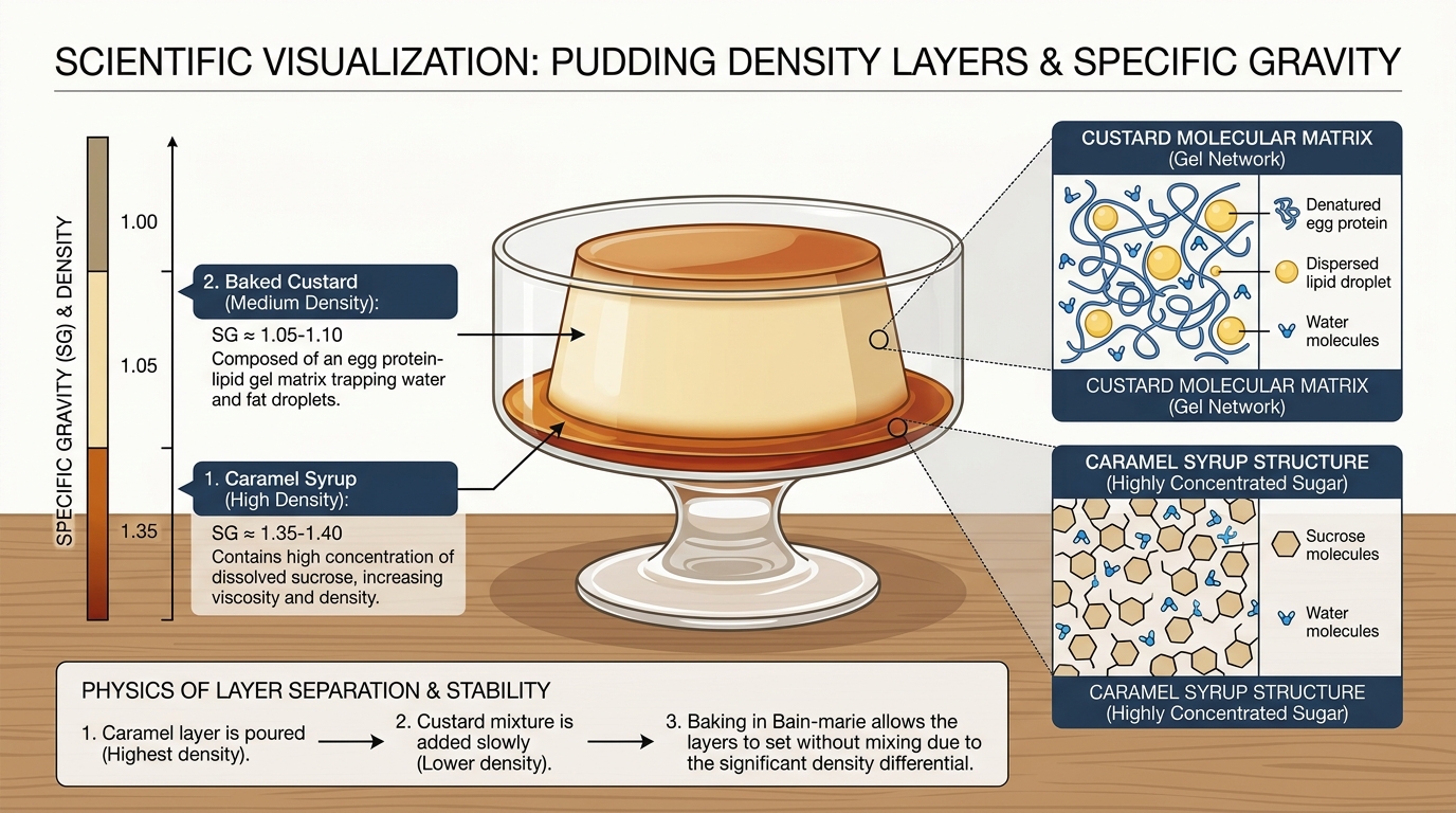 카라멜 시럽은 설탕을 고온에서 졸여 만들기 때문에 물보다 훨씬 무겁습니다. 용기에 시럽을 먼저 붓고 그 위에 조심스럽게 커스터드 액을 채우면, 비중 차이로 인해 두 액체가 섞이지 않고 뚜렷한 경계선을 만들어냅니다.